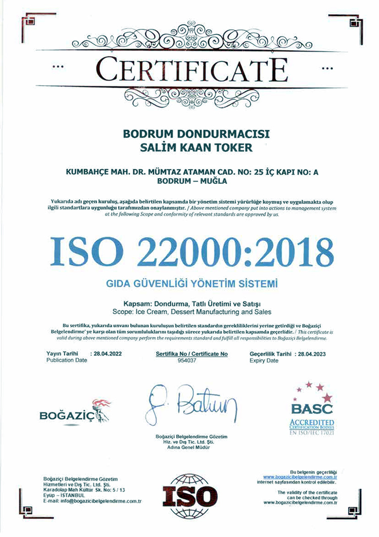Bodrum Dondurmacısı üretimin her aşamasında gösterdiği hassasiyetin neticesi olarak ISO 22000:2018 Gıda Güvenliği Yönetim Sistemi belgesine sahiptir.
